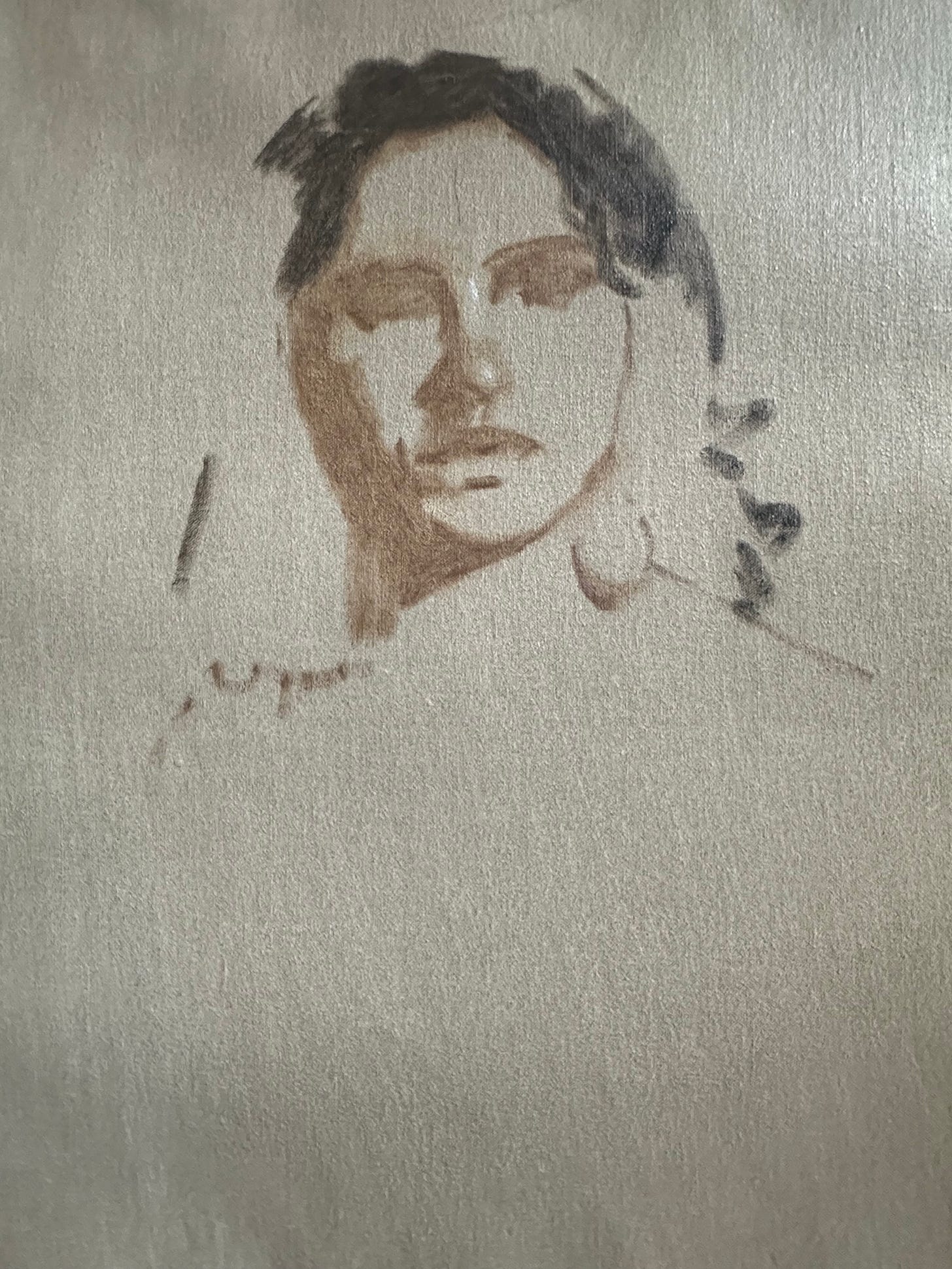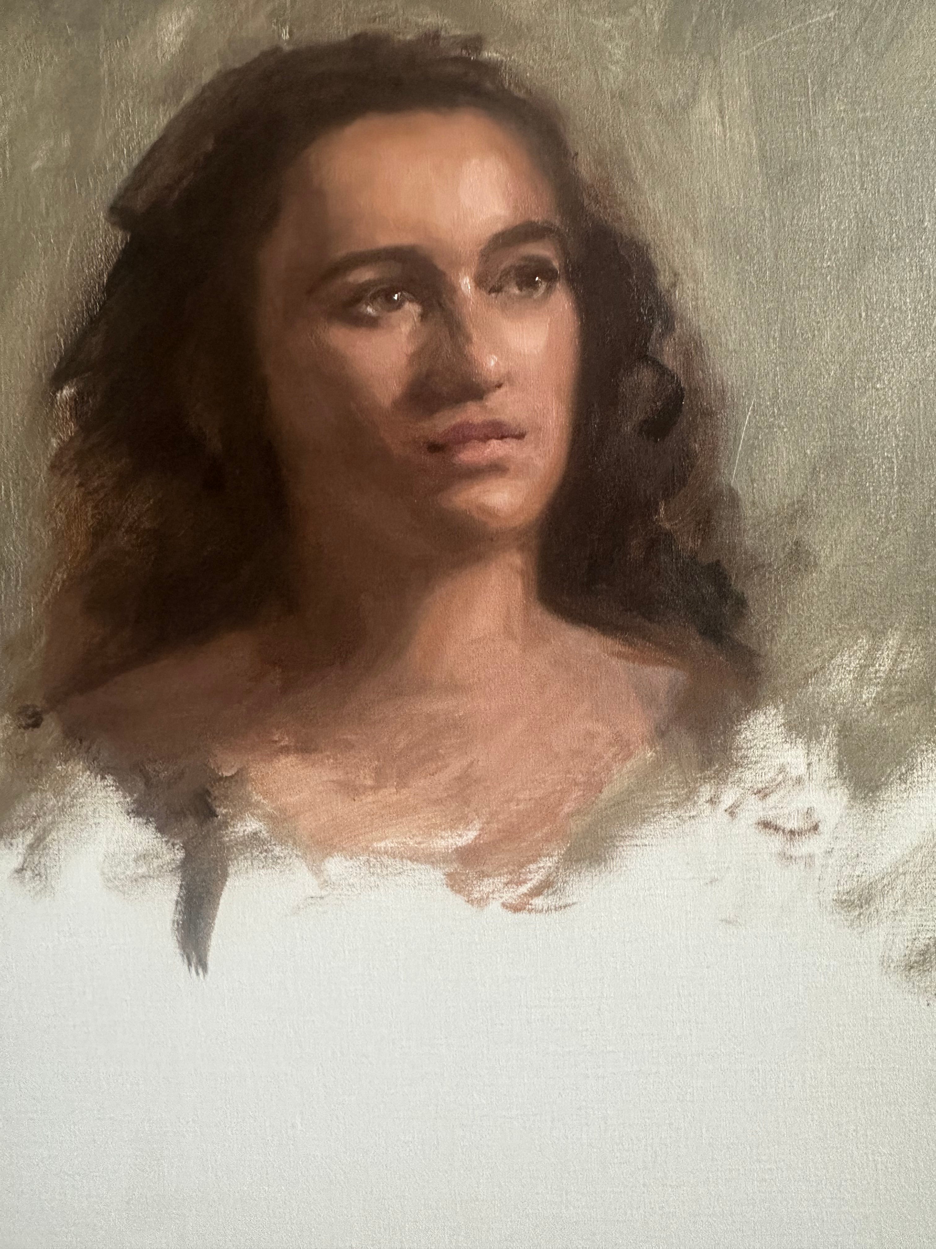 After deciding upon the margins of their subject, the painters step rhythmically backwards and forwards, using a traditional method called sight-size. Walking five paces back, they would look at me, look at their canvas —tilting their head cat-like— then walk five paces forward, set down one stroke, then take five paces backwards again. One of the painters while walking towards me would use his paintbrush as a kind of conductor’s baton, making hand movements that moved over my face to the canvas, mimicking the lines and shapes he wanted to replicate there. Often, after placing the lines down, he would make an outburst of dissatisfaction; what I thought of this, as I sat very still, was that the in-between space was the most generative for this particular painter, that this was the place where he was most fully in cohesion with his artistic vision. It was in that pose, holding his arm like a conductor’s baton, between having made a mark and not having made a mark, where he seemed most at peace with what he was doing. Otherwise, he seemed to be completely unhappy. In the corner of my eye, the other painter with the searing gaze worked calmly. I did not hear her sigh once.